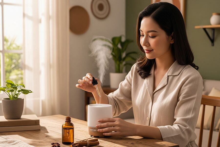Chỉ vài giọt tinh dầu trong máy xông, không gian sống sẽ trở nên thơm mát, sạch khuẩn, hạn chế nấm mốc và mùi ẩm thấp. Đây là giải pháp tự nhiên, an toàn thay cho xịt phòng hóa học và các chất tẩy mạnh.