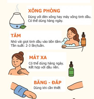 Bôi da: 1 giọt + 20–30 giọt dầu nền